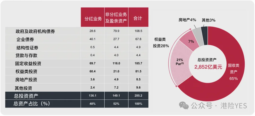 以友邦2025年财报为例,2852亿美元的投资资产,固收类占65%,权益类占28%。