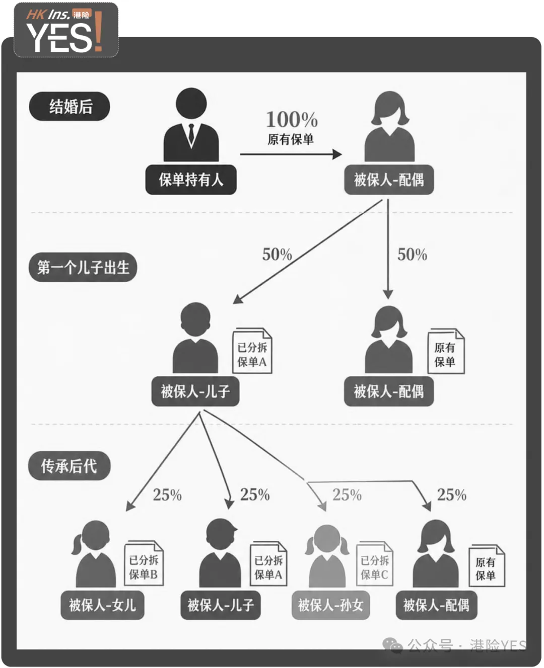 在世时,你可以将保单拆分成多份,通过变更保单持有人和被保险人,灵活分配给不同的家庭成员。